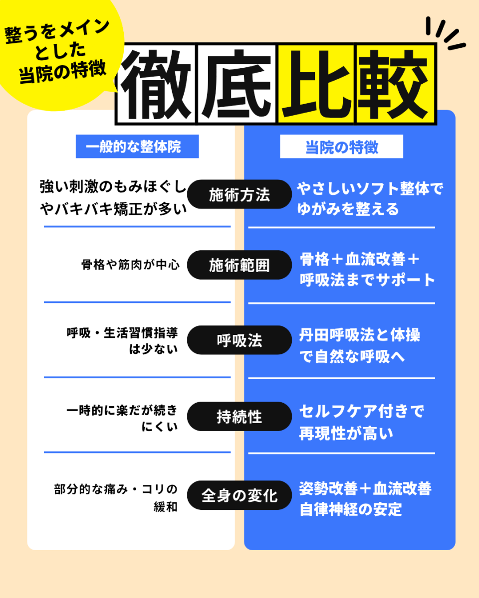 股関節や腰のねじれを整えることで、立つ、座る、歩く動作が安定し、腰の負担が軽くなります