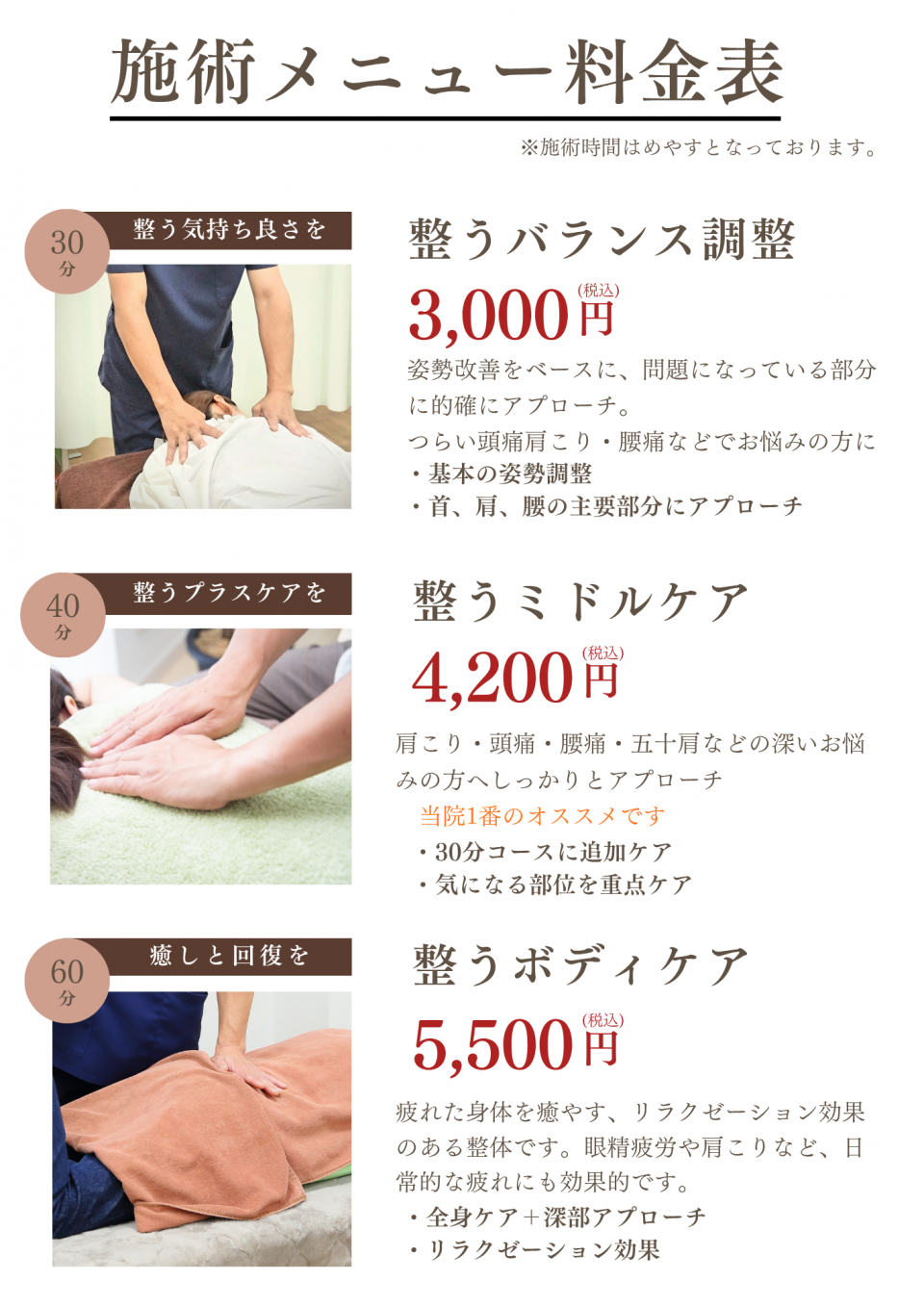 疲れた身体を癒す、リラクゼーション効果のある整体です。眼精疲労や肩こりなど、日常的な疲れにも効果的です。