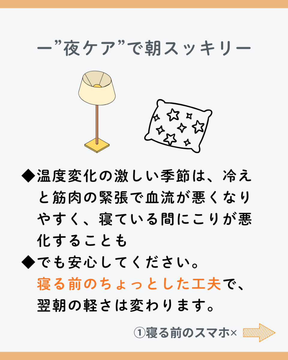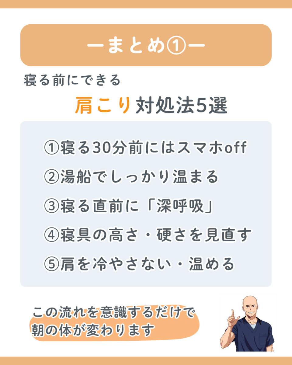 いかがだったでしょうか。「寝るだけで肩がこる」という人ほど、寝る前のリセット習慣が大切です。みなさんも少しずつ始めてみませんか?